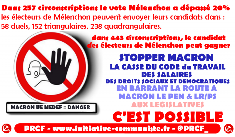 Côté direction du PCF, Pierre Laurent continue de cultiver la confusion en mettant sur le même plan les candidats de la France insoumise, ceux du Ps pro-Hamon et ceux. .. de son propre parti (cf ses déclarations du 30 mai sur France-Info dans l’émission d’Apathie). L’important est selon lui de faire en sorte que « la gauche », quelle qu’elle soit, accède au second tour. Et par avance, Laurent appelle à retirer ce candidat au profit du candidat Macron si le candidat FN semble éligible…