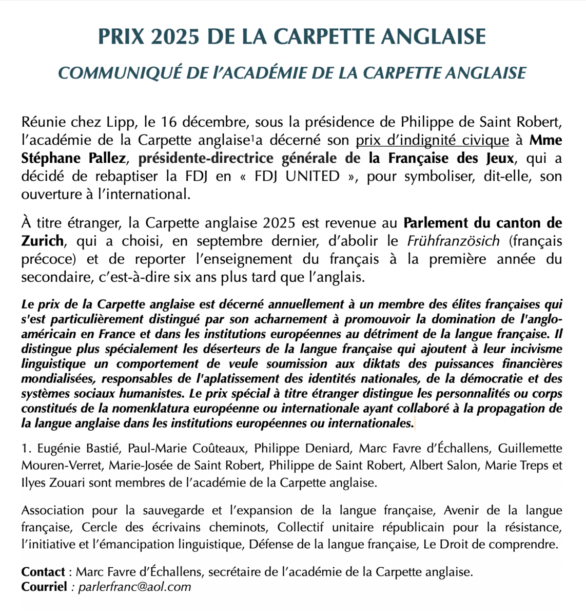 Le prix 2025 de la carpette anglaise attribué à la Française des Jeux FDJ et au canton de Zurich pour leurs atteintes à la diversité linguistique