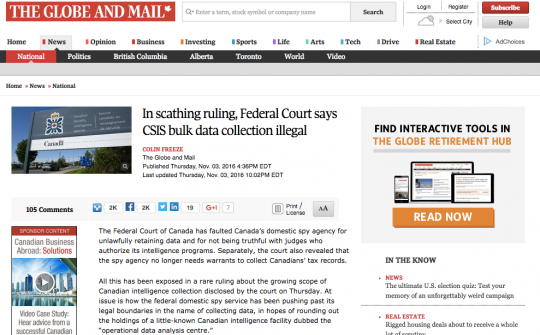 Jeudi, une condamnation encore plus cinglante de la surveillance de masse a été prononcée par la Cour Fédérale du Canada. Elle a “mis en faute l’agence de surveillance intérieure du Canada pour l’enregistrement illégal de données et pour ne pas avoir été honnête avec les juges qui avaient autorisé les programmes de renseignement.” Le point le plus remarquable est que ces activités de surveillance de masse étaient non seulement illégales mais totalement inconnues de la quasi-totalité de la population de la démocratie canadienne, même si leurs objectifs a des implications concernant les libertés fondamentales. “Le centre en question est le Canadian Security Intelligence Service, équivalent à une boule de cristal – un endroit où des analystes du renseignement tentent de prévoir les menaces du futur en examinant et en ré-examinant de grandes quantités de données.”