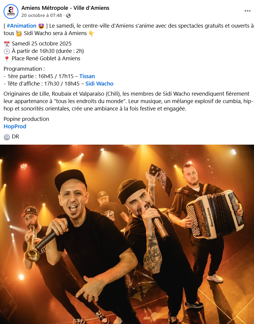 Samedi 25 octobre, Amiens a eu la chance d’accueillir le groupe Sidi Wacho. Originaires de Lille, de Roubaix, et de Valparaiso (Chili), ils ont donné au cœur de la ville un concert festif mélangeant joyeusement hip-hop, musique latine, orientale ou encore des Balkans, avec des paroles en français et en espagnol. Les membres de Sidi Wacho, par ailleurs, ne se cachent pas d’être du côté de la classe ouvrière et des peuples opprimés. Et notamment Saïdou, ancien du Ministère des affaires populaires.