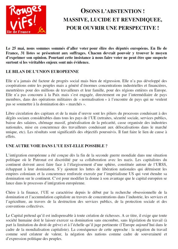 Boycott des élections européennes, les appels d’Action Communiste et Rouge Vif Ile de France :