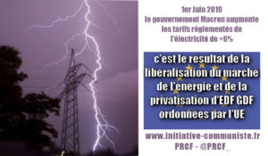 +6% c’est la hausse des tarifs réglementés d’électricité qui a été décidée par le régime Macron. Une hausse spectaculaire qui est le résultat… de l’ouverture à la concurrence du marché de l’électricité et de la fin du monopole par le service public EDF GDF imposée par l’Union Européenne. En effet, la commission européenne a imposé … Lire la suite de Hausse des tarifs de l’électricité : C’est l’Union Européenne qui est responsable !