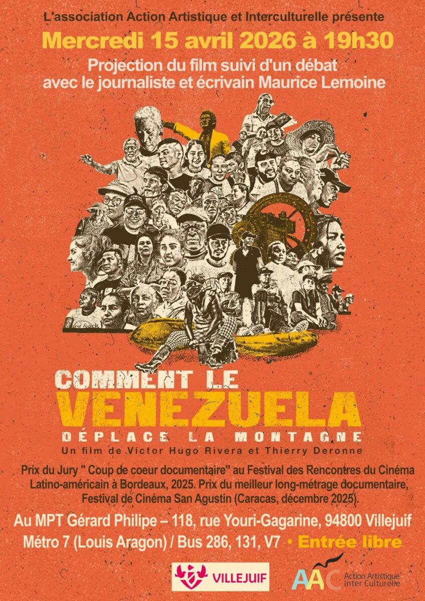 « Comment le Venezuela déplace la montagne », le documentaire que j’ai coréalisé sur ce thème avec Victor Hugo Rivera sera projeté à Villejuif, le 15 avril. à 19h30, à la Maison pour Tous Gérard-Philippe, 118 Rue Youri Gagarine (Ligne 7, station Villejuif – Louis Aragon). Cette projection sera suivie d’une rencontre avec l’ex-rédacteur en chef du Monde Diplomatique Maurice Lemoine, qui revient du Venezuela, répondra aux questions du public.. Ce film offre de multiples témoignages sur les expériences menées d’une autre forme d’organisation sociale : les communes qui se déroulent dans différentes régions du Venezuela : des Andes aux terres de Miranda, Lara, ou Cumanacoa. Aujourd’hui, les Communes sont au nombre de 5000, s’appuyant sur 49 000 conseils communaux. Il s’agit pour des pêcheurs, des cultivateurs de café, de cannes à sucre ou de cacao de prendre en main la transformation sociale, économique et politique.