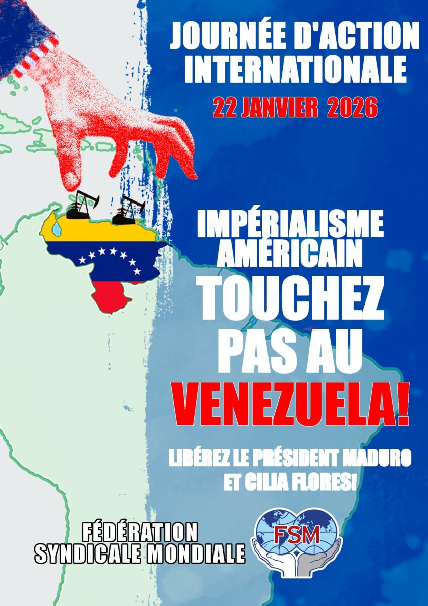 La FSM appelle ses membres à participer activement à cette Journée d’Action Internationale, en organisant des initiatives militantes devant les ambassades des États-Unis sous les slogans : « Impérialisme américain, touche pas au Venezuela ! » et « Libérez le président Maduro et Cilia Flores ! ».