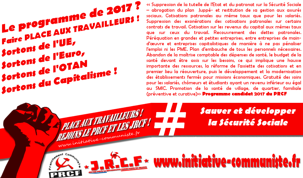Au delà de Fillon, la casse de la Sécu, voulue par la classe capitaliste, ces grands patrons, marchés financiers, multinationales et imposée par l’Union Européenne en application des traités européens et sous la pression de l’Euro est également au menu des différentes composantes du parti capitaliste unique, Valls, Monteborg, Le Pen, Macron… En réalité, comme à sa création, c’est du coté des communistes qu’il faut chercher les défenseurs du droits à la santé pour tous, non seulement pour sauver la Sécu, mais bien pour étendre la Sécurité Sociale. Les militants du PRCF défendent ainsi un programme offensif et de progrès social, prenant appui sur cette conquête sociale essentielle qu’est la Sécurité Sociale.