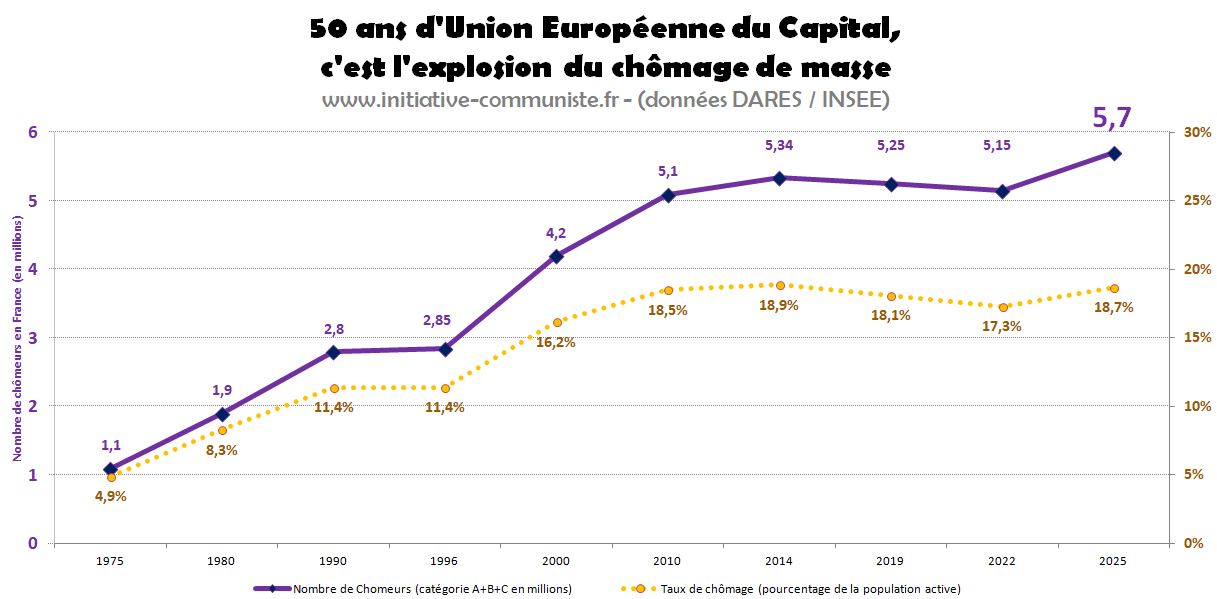 Sur une plus longue période, par exemple à compter de l’entrée de la France dans le système monétaire européen, au tournant des années 1970 et 1980 qui ont en réalité étaient les années de préparation de l’économie au passage à la monnaie unique, l’euro, il faut observer un doublement du chômage le plus dur (catégorie A) et un quintuplement du nombre de chômeurs inscrits au chomage. de 5% de la population active au chômage, en 1975, les chiffres ont atteinte des proportions particulièrement violente de de 18.7% en 2025.