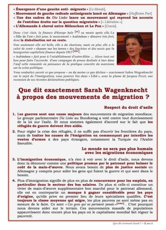 Aussitôt les médias dominants (par exemple ce dimanche encore sur la 5 dans l’émission « C Politique la position de » Sahra Wagenknecht » est carrément qualifiée d’anti-immigrante rejoignant en quelque sorte le positionnement raciste de l »AfD en Allemagne ou du FN en France.