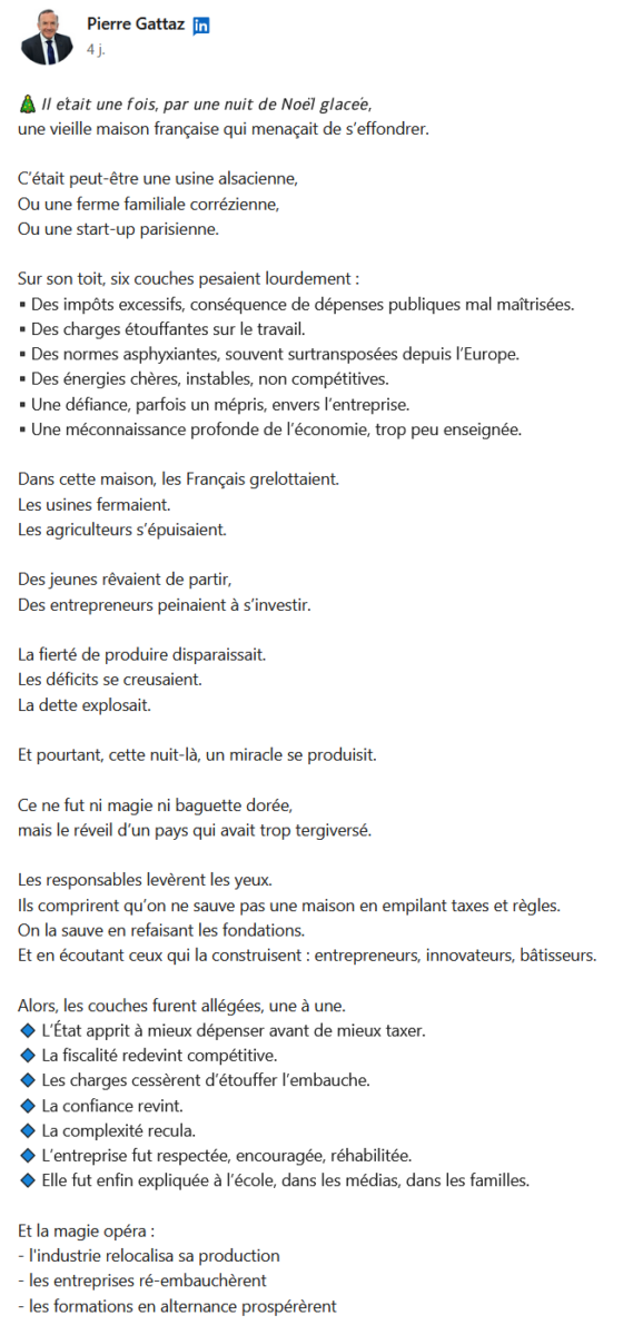 Pierre Gattaz, grand mandarin et grand manitou du MEDEF (de père en fils) vous a écrit un conte de Noël, rien que pour vous :