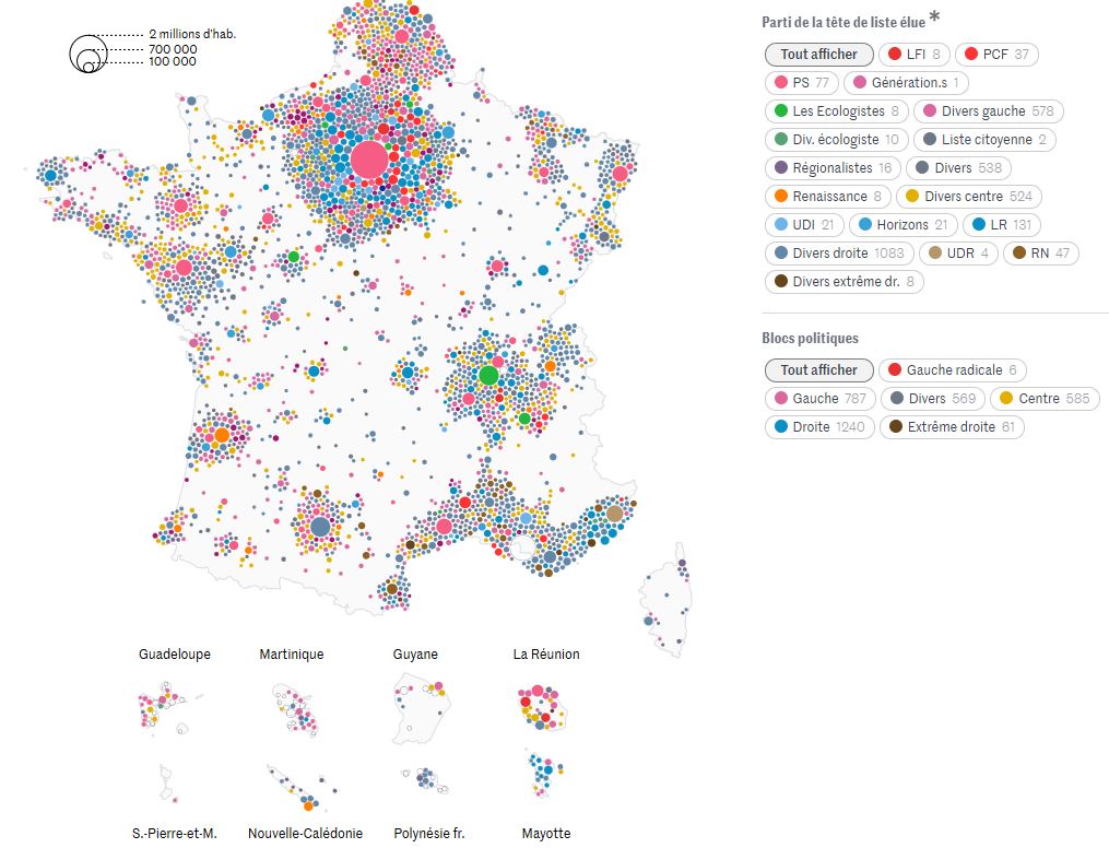 Si la victoire d’une tête de liste PCF à Nîmes est la bonne surprise de la soirée, elle n’efface pas les écarts désormais fortement installés avec la droite au Havre et à Arles. Au soir du second tour, dans les villes de plus de 3500 habitants, le journal le monde produit un décompte politique signifiant, ce qui concerne 3 255 communes françaises représentant 46,4 millions :