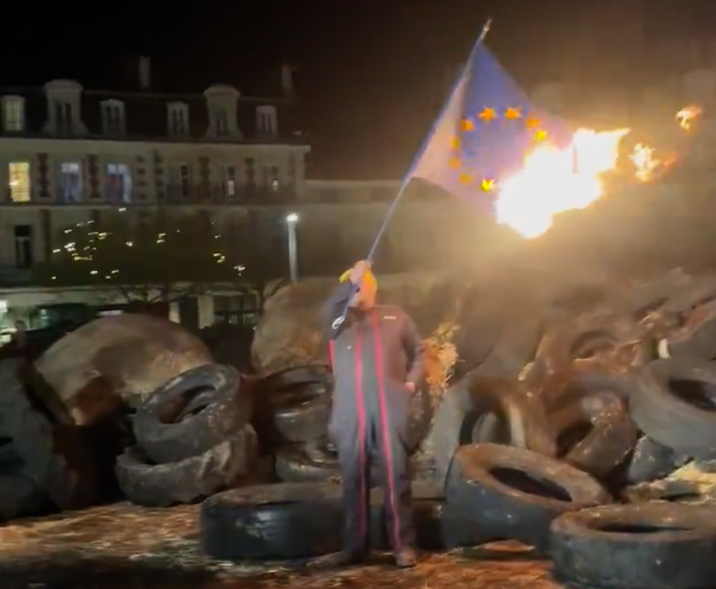On remarquera que Jeremy Forêt porte le discours pro Union Européenne de la Confédération Paysanne, un syndicat qui s’exprime pour rester dans l’UE et une réforme de celle-ci, une analyse qui fait fortement débat dans les actions puisque un nombre croissant de paysans ne croient pas à ces promesses idéales de « changer l’Union Européenne » que chacun entend en boucle depuis 40 ans avec les résultats que chacun peut observer, une UE qui ne fait que pousser dans l’ultra capitalisme et désormais de façon ouverte et dangereuse dans la guerre. Sur les ronds points, les péages et les échangeurs bloqués, c’est bien le drapeau de l’Union Européenne qui est brulé, la présidente de la commission européenne qui est ciblée comme responsable de la catastrophe en cours. En-effet nombre de paysans subissent les ravages de la politique agricole commune et constate que l’Union Européenne est avant tout, structurellement, une machine d’exploitation faite pour et par l’agro capitalisme, pour agir de façon impérialiste sur les marchés mondiaux et totalement tournée contre l’agriculture paysanne qui est au cœur du modèle agricole en France.