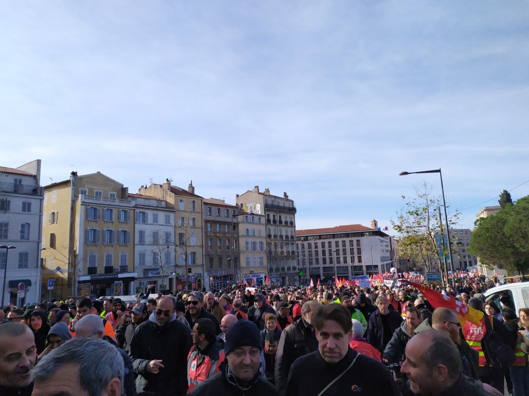 À Marseille, où le port est bloqué par les dockers, où le ramassage d’ordures est à l’arrêt malgré les tentatives de briser la grève, c’est un cortège bien fourni de 75 000 manifestants qui a défilé de la porte d’Aix à la Préfecture, emmené par un solide cortège de dockers.