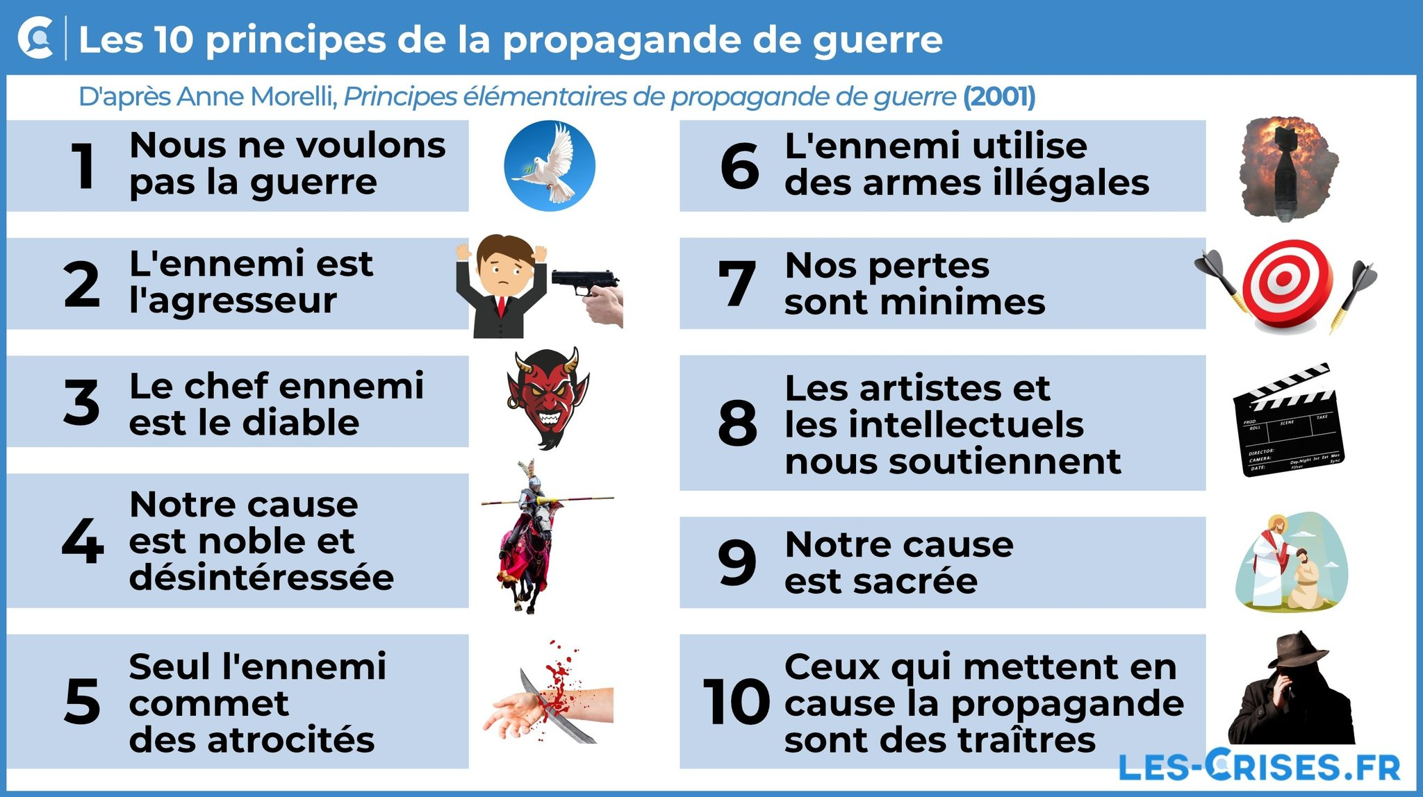 l’historienne Anne Morelli a donné une explication claire des dix principes de la propagande de guerre. Des principes dont on peut rapidement se rendre compte qu’ils sont particulièrement utilisés, de façon systématique par Emmanuel Macron. Ce dernier n’a de cesse en-effet que de pousser à l’escalade guerrière de l’UE OTAN contre la Russie, poussant d’ailleurs à l’implication direct des soldats français au combat. N’a t’il pas ainsi pousser son tout nouveau chef d’Etat Major le général Mandon à appeler les maires des 35 000 communes de France à faire la propagande auprès de leurs administrer des sacrifices pour la guerre, non seulement de leurs économies et salaires, mais également …. de leurs enfants !