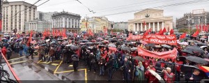 les travailleurs étaient mobilisés, à l’appel des syndicats (plus d’une centaine de milliers de personnes). Le parti communiste (KPRF) avait organisé une mobilisation rejoignant la place du théâtre.