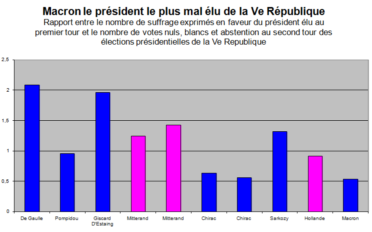 Au second tour, pour 10 électeurs ayant mis le bulletin macron dans l’urne, il y en a 8 qui ont choisi le vote blanc, nuls ou l’abstention. Seul Pompidou avait fait pire.