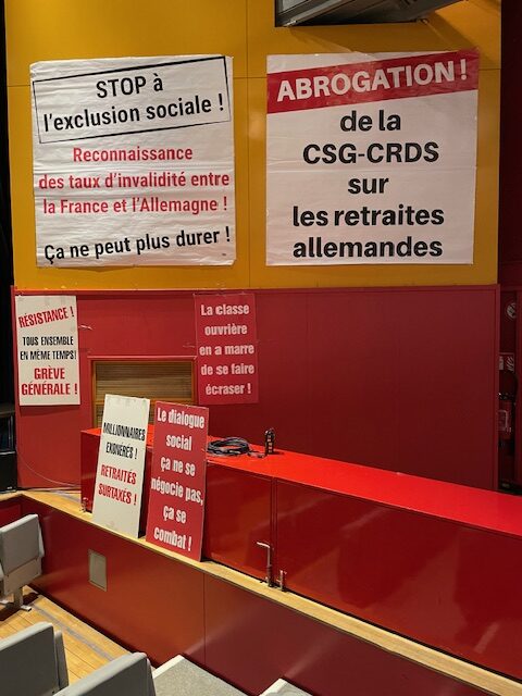 Autres gros dossiers en cours : – CSG-CRDS sur les retraites allemandes ; La réforme de l’indemnisation chômage, qui ne serait plus versée par le pays de résidence, la France, mais le dernier pays d’activité « ce qui pénaliserait lourdement les travailleurs frontaliers : longs déplacements pour l’inscription en Allemagne, formation professionnelle impossible vu la barrière linguistique, les anciens tomberaient dans la misère, le maintien des droits ne serait plus assuré. » – double imposition des frontaliers intérimaires, problématique des allocations familiales – cure …
