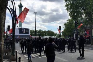 Ce 1er mai, le PRCF avait pavoisé de drapeaux rouges et tricolores le boulevard Beaumarchais, à l’entrée même de la place de la Bastille. Les couleurs claquaient si fort au vent des luttes qu’on se serait cru dans la rue Montorgueil du tableau de Monet. Une belle manif populaire en perspective, où le tricolore qui avait marqué la journée du 18 mars et l’envol de la France insoumise, devait – il était temps – se replonger au le bain de jouvence et de l’Internationale et du rouge ouvrier. Plus que jamais, c’est cette alliance victorieuse qui était à l’ordre du jour : transformer dans la rue l’essai concluant des 19% dans les urnes, afin d’élever le rapport de forces avec le Capital.
