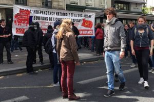 Annette a pris des photographies de notre point de rassemblement, et plus généralement notre installation a été l’objet de nombreuses photographies de divers militants, passants et même de touristes, et ainsi l’objet de discussions au cours desquelles nous arrivons globalement à bien faire passer nos idées ; évidemment, avec certains militants trotskistes et européistes c’est plus compliqué, mais ce qui est important est le fait que des personnes non militantes acceptent d’entendre notre message, c’est très encourageant !