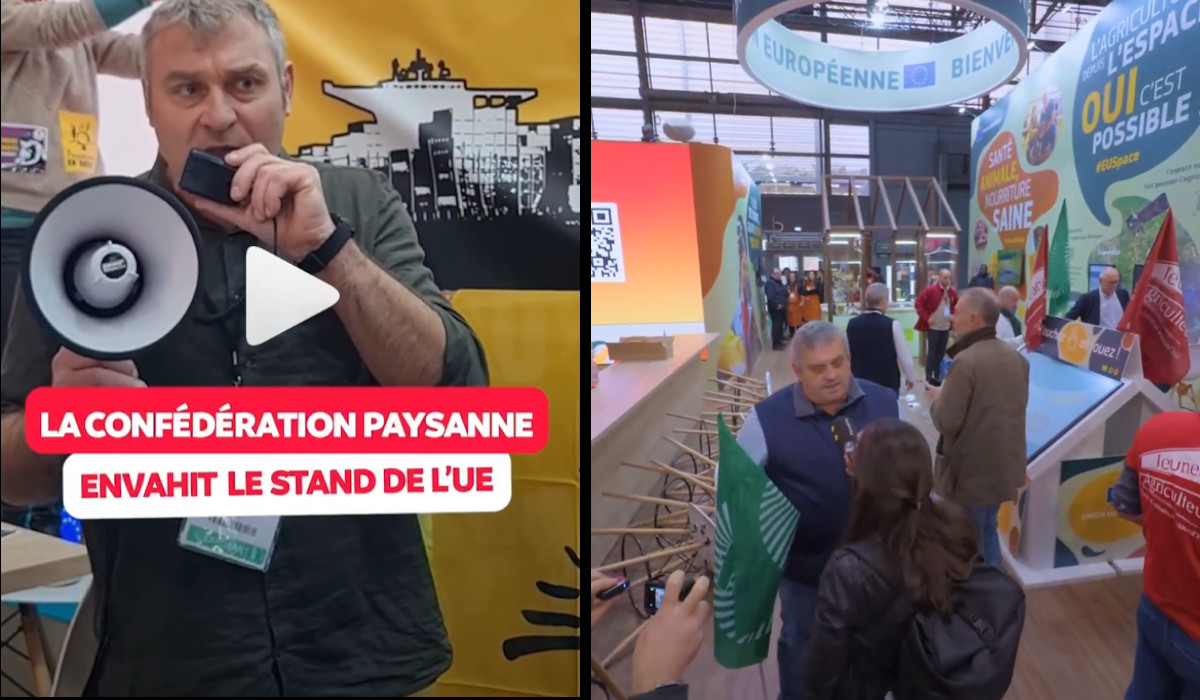 La confédération paysanne occupe le stand de la commission européenne et appelle à sortir de l’Union Européenne libéral