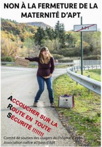 L’histoire est longue et pour la résumer on peut dire que la maternité d’Apt est dans le collimateur de l’ARS (agence régionale de santé) PACA depuis longtemps : Le seul argument mis en avant a toujours été le nombre insuffisant d’accouchements réalisés (300 par an, ce qui est le chiffre en-dessous duquel le ministère cherche à fermer les maternités). Jamais aucun argument de mauvaise qualité des soins n’a pu être mis en avant et, au contraire, toutes les accréditations ont toujours été acquises par la maternité dont le renom n’est plus à faire, et dont l’existence est en plus rendu nécessaire par l’éloignement d’Apt (et des communes du Pays d’Apt classées pour plus de la moitié en « communes de montagne ») de structures de soins plus importantes (Cavaillon 35 kms – Avignon 50 kms). Grace aux combats menés par le comité de défense et la population (2000 personnes lors d’une manifestation locale le 22 novembre 2014), la décision de fermeture avait toujours été reportée, mais de 6 mois en 6 mois, ce qui a inévitablement provoqué progressivement l’angoisse et le découragement du personnel et une relative défection de la fréquentation de la maternité qui ne réalisait plus que 240 accouchements par an dernièrement. S’est ajoutée à cela la difficulté de recrutement d’un gynéco-obstétricien (la pénurie nationale de médecins est une triste réalité) et l’ARS a bondi sur ce prétexte pour annoncer le 9 novembre, la fermeture de la maternité au 31 décembre de cette année !