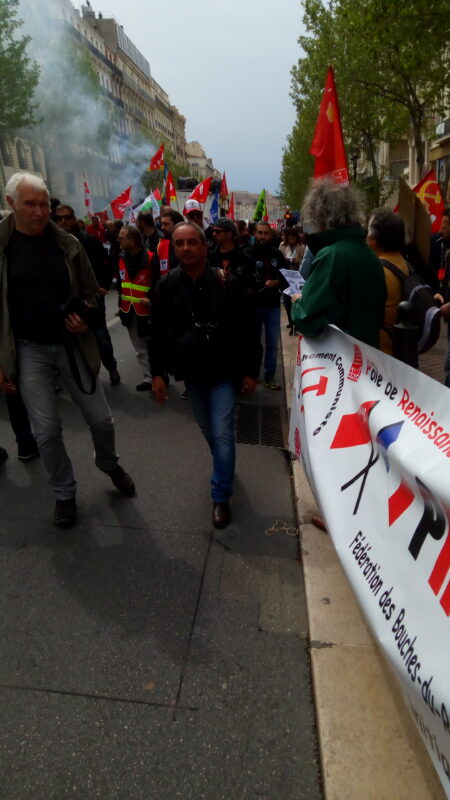 Une délégation du PRCF était présente à la manifestation. Après avoir diffusé plus de 4000 tracts à l’intersection entre la Canebière et la Rue de Rome pour appeler les Marseillais à rejoindre la mobilisation et défendre leurs droits, leurs emplois, leurs salaires, leurs services publics contre les privatisations et le dumping social impulsés par l’Union Européenne du Capital, la délégation du PRCF a tenu un point fixe pour saluer le défilé des organisations syndicales . S’il faut regretter que quelques rares sections de la manifestation – très fournie et dynamique en général au demeurant – n’avaient pas de slogan à l’image du camion sono PCF diffusant des chansons, ce n’était pas le cas de la grande majorité du cortège tout particulièrement de la CGT et de la France Insoumise. Les militants franchement communistes du PRCF ont participé à l’animation tout le long de la manifestation en proposant leurs slogans. Faisant le lien entre les différentes luttes en cours contre les europrivatisations (SNCF, Poste, EDF etc.) la sélection à l’université ou la casse du bac, l’euro austérité détruisant les retraites, les salaires, les statuts, les services publics et les directives européennes. Des slogans très bien reçus et repris par de nombreux manifestants.