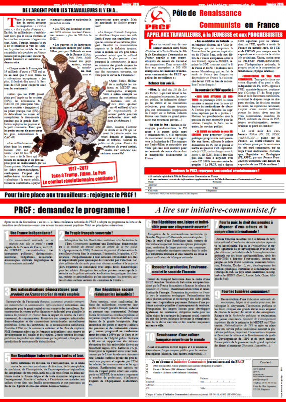 • d’un grand parti communiste totalement indépendant du PS, du PGE et de l’UE, donc de l’appareil euro-formaté et socialo-dépendant du PCF-PGE actuel, dont nombre de dirigeants se compromettent, sous couvert d’union à tout prix, dans un indécent rabattage vers Hamon et l’ « union de la gauche » moribonde. Sans cette reconstruction du parti communiste véritable, la résistance antifasciste partirait mal, l’euro-dissolution (sociale, industrielle, linguistique, etc.) de la France deviendrait vite irréversible (« défense européenne » = remise à Berlin du « parapluie nucléaire » français et désarmement unilatéral du pays), les résistances sociales privées d’avant-garde politique iraient dans le mur.