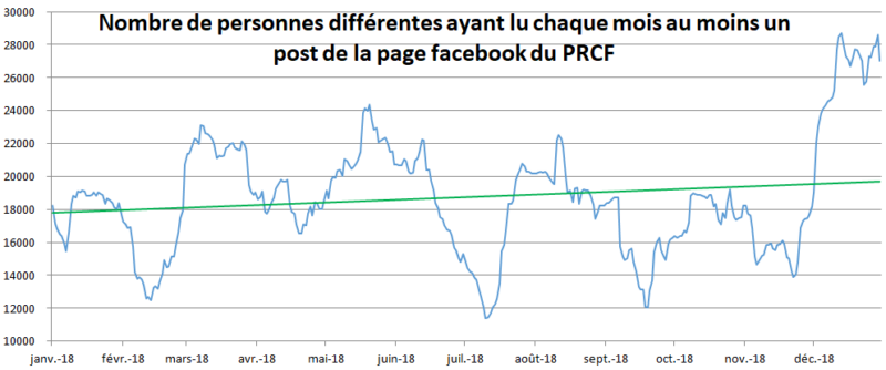 - chaque mois c’est en moyenne 19 000 personnes différentes qui lisent les posts de la page facebook du PRCF, pour un total de près de 100 000 lectures