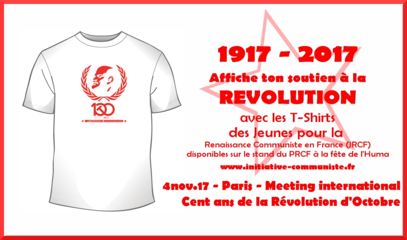 Pour faire de 2017 l’année de relance de l’élan révolutionnaire, pour vous mobiliser pour la paix, la solidarité internationale, le progrès social et écologique, pour défendre l’Humanité contre l’exterminisme capitaliste, mobilisez vous le 4 novembre 2017 lors du grand meeting international du centenaire de la Révolution d’Octobre à Paris. Au coté des communistes et militants de toutes la France, retrouvez des délégations de communistes venus des cinqs continents ( Syrie, Palestine, Italie, Espagne, Grande Bretagne, Suisse, Suède, Philippines, Danemark, Liban, Mali, Corée du Sud, Indonésie, Pologne, République Tchèque, Brésil, Portugal, Venezuela, Cuba…)