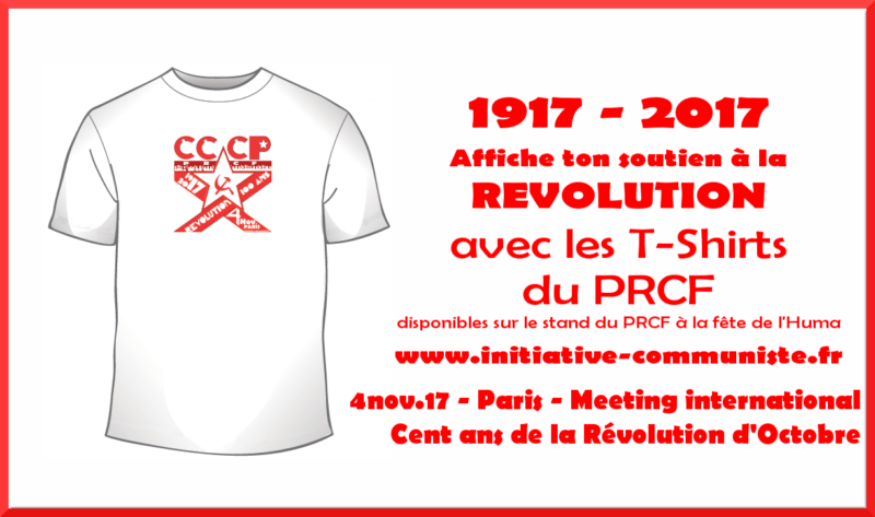 Retrouvez les deux tshirts édités par le PRCF et les JRCF pour le centenaire de la révolution d’octobre. Ils seront disponibles sur le stand du PRCF à la fête de l’Humanité.